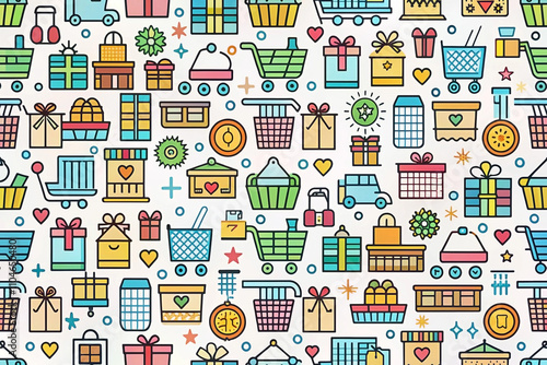 Colorful seamless pattern with shopping carts, gifts, and boxes.