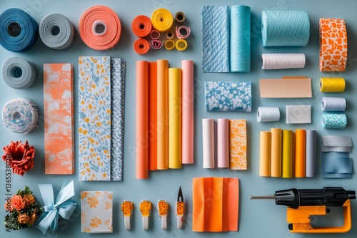 Colorful sewing supplies arranged in neat geometric layout on orange background