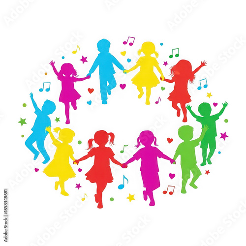 Colorful silhouettes of children dancing in a circle with musical notes isolated on transparent background