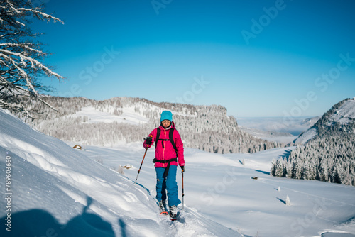 colorful ski tourer in white winter landscape