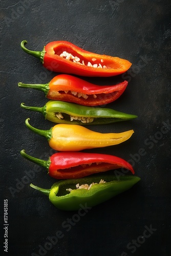 Colorful sliced chili peppers on a dark backdrop.