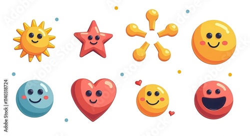 Colorful Smiley Faces and Fun Shapes Illustration Set with Cute Characters for Kids' Designs and Emojis
