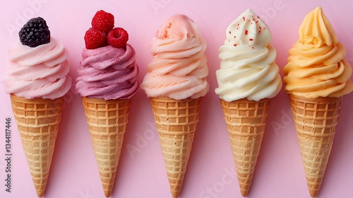 Colorful soft serve ice cream cones in row showing different flavors topped with berries and sprinkles on pink background, sweet frozen dessert variety.