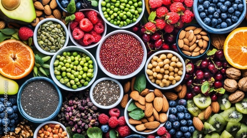 Colorful Spread of Superfoods, Fruits, Nuts, and Seeds.A Celebration of Healthy, Nutrient-Rich Eating