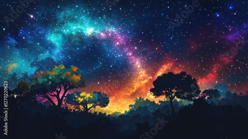 Colorful starry night sky over forest. Artistic landscape. Possible use Desktop wallpaper