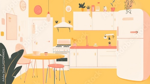 Colorful, stylized kitchen interior, modern design, breakfast nook