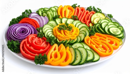 Colorful Vegetable Platter Displaying Sliced Cucumbers Peppers and Onions on White Plate