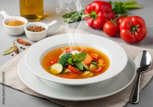 Colorful Vegetable Soup in a Bowl with Steam and Fresh Ingredients