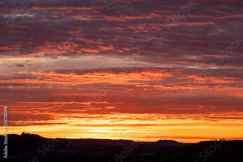 Colorful vineyard landscape at sunrise in La Rioja, Spain, vibrant autumn tones and layered hills creating a warm rural scene with nature and copyspace for seasonal design concepts