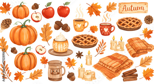 Colorful watercolor autumn elements clipart set