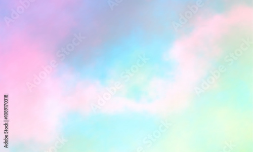 Colorful watercolor background of abstract sunset sky with puffy clouds in pastel rainbow colors of pink blue yellow orange and
