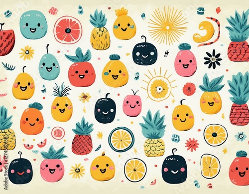 Colorido dibujo a mano de dibujos animados de frutas tropicales lindos y caras soleadas en un fondo ligero