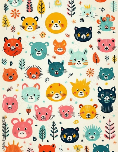 Colorido dibujo de dibujos animados con animales del bosque lindos y caras soleadas en un fondo ligero