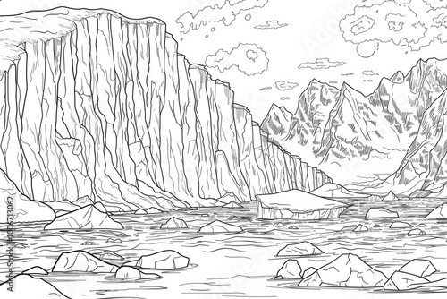 Coloring book illustration of a towering glacier wall in a polar environment with a massive snow covered iceberg floating in chilly waters Themes of ecology and climate change