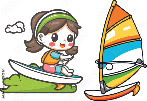 coloring page features a simple drawing of red green with baby girl playing windsurfing vector