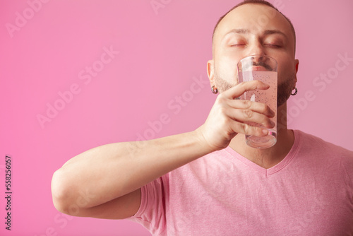 Colour obsession concept. Bearded hipster muscular guy drinking fruit juice over pink background. Minimalistic poster style. Copy-space. Studio shot