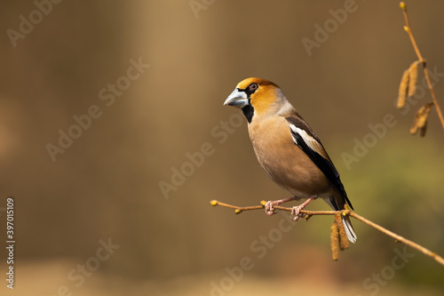 Colourful hawfinch, coccothraustes coccothraustes sitting on the hazel tree in springtime. Big songbird resting and enjoying the sunlight. Finch with massive beak perched on the blooming twig.
