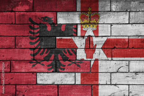 colourful painted big national flag of northern ireland and flag of albania on a massive old brick wall background. concept