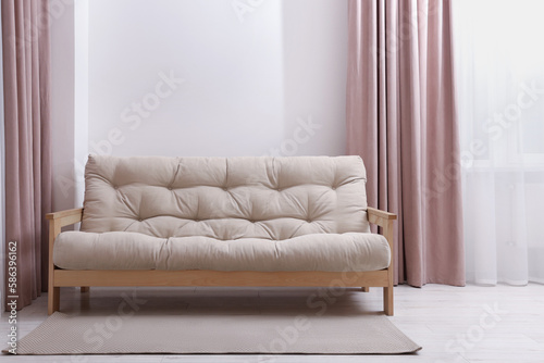 Comfortable sofa with rug in cozy light room. Interior design