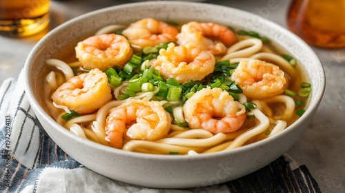 Comforting bowl of udon noodles tempura shrimp green onions and a light broth