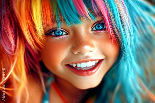Commercial digital ads idea. Attractive smiling black girl - for ads, brochure and social apps use. Long haircut - multicolored hair. Long hair black model portraits. Model concept.