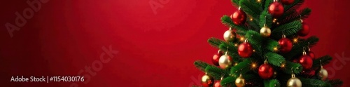 Compact artificial Xmas tree, colorful baubles, bright lights, red festive setting, sparkle, bauble