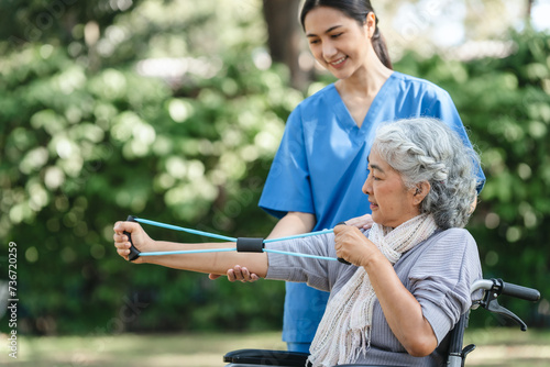 Compassionate Asian woman provides care to elderly person in wheelchair outdoors. Engaging in physical therapy, happiness, encouraging positive environment for mature individuals with grey hair.