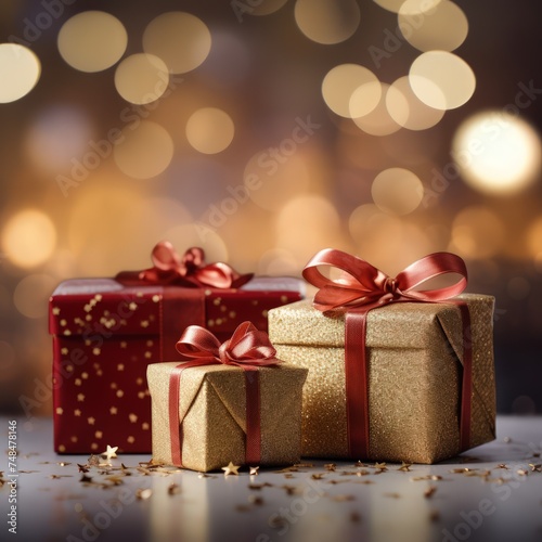 Compose a captivating image of a delectable gift boxs set against a festive Christmas bokeh background