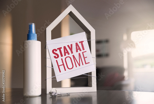 Composing with white house, disinfection spray and key in front of a living room with statement "Stay At Home"