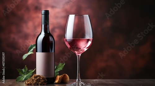 Composition of an elegant bottle of red wine and a glass of rose wine on a dark red background, surrounded by figs and grape leaves with copy space, for advertising, website, blog, marketing