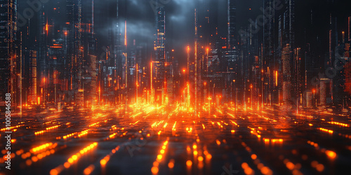 Composition of figures that falls on the chart of technical analysis, black background, orange colors neon light