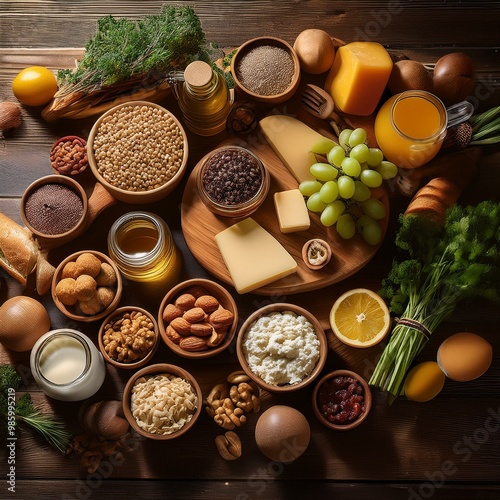 Composition with assorted organic food products on wooden table