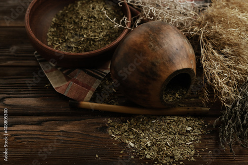 Composition with yerba mate tea on wooden table