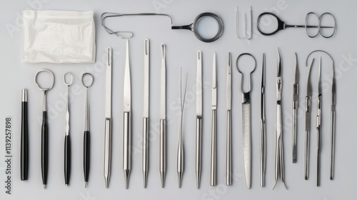 Comprehensive Collection of Surgical Instruments for Medical Professionals Featuring Scissors, Forceps, Tweezers, and More in a Neatly Organized Display for Educational Use