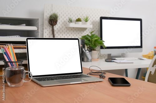 Computer laptop, coffee cup and mobile phone on wooden desk.