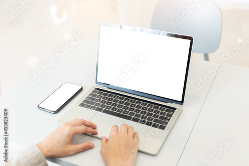 computer screen,cell phone blank mockup.work using laptop texting mobile.white background for advertising,contact business search information on desk in cafe.marketing,design.