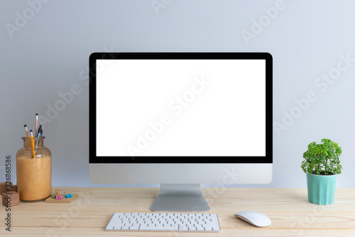 Computer with blank white copy space for text, Mockup design desktop computer in office on wood table with keyboard.