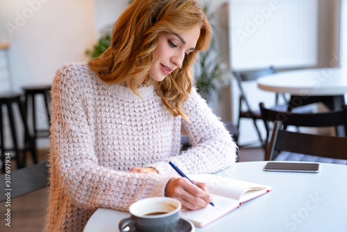 Concentrated pretty young blonde woman writing notes