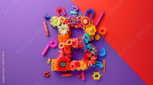 concept letter B made of toys and art supply isolated on red and purple background