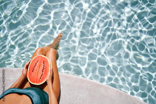Concept of diet, spa and cosmetics. Enjoying tropical fruits, suntan and vacation. Young slim woman in green swimsuit sitting near swimming pool holding watermelon.