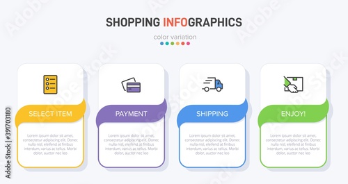 Concept of shopping process with 4 successive steps. Four colorful graphic elements. Timeline design for brochure, presentation, web site. Infographic design layout.