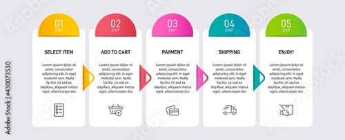 Concept of shopping process with 5 successive steps. Five colorful graphic elements. Timeline design for brochure, presentation, web site. Infographic design layout.