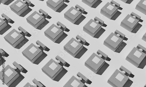 Conceptual concrete bottles patternon on white background, top view. sunlight. Flat lay. 3d rendering