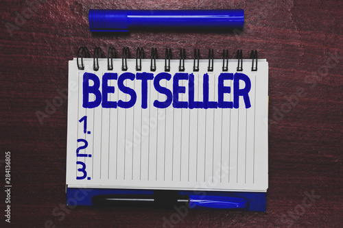 Conceptual hand writing showing Bestseller. Business photo text Book product sold in large numbers Successful literature Open notebook page marker communicating ideas wooden background
