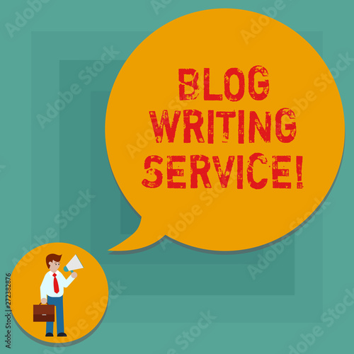 Conceptual hand writing showing Blog Writing Service. Business photo text Creates highquality blog content for a business Man in Necktie Carrying Briefcase Holding Megaphone Speech Bubble
