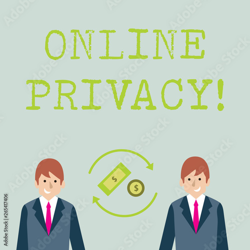 Conceptual hand writing showing Online Privacy. Concept meaning involves the control of what information you reveal online Money in Dollar Sign in Rotating Arrows Between Businessmen