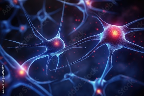 Conceptual illustration of neuron cells with glowing link knots in abstract dark space, high resolution 3D illustration