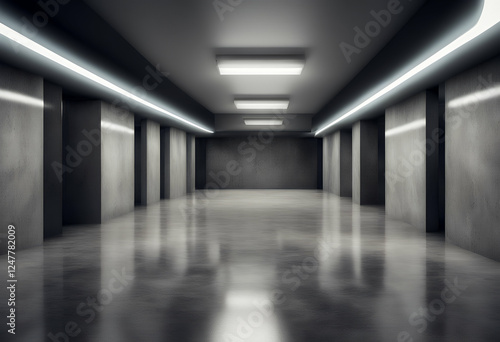 concrete glossy gallery corridor showroom hallway 3d white lights rendering hall elegant empty dark stripe grunge tunnel big underground garage studio three-dimensional abstract architectural