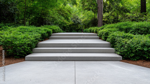 Concrete steps green shrubs trees pathway serene outdoor garden