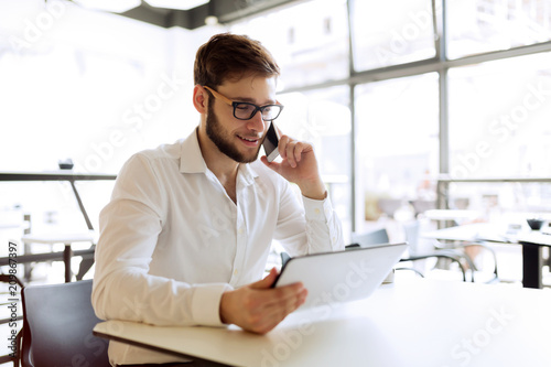 Confident busy businessman working on tablet